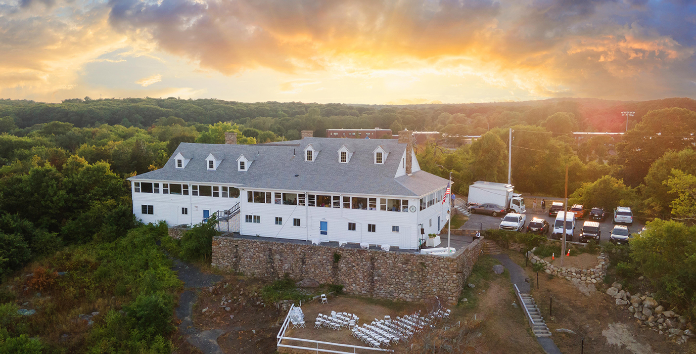 The Rockport Golf Club clubhouse, circa 1915, retains a rustic country feel with a classic fieldstone fireplace that goes from the floor to the beamed ceiling, with ocean views and the capacity of 125 people.